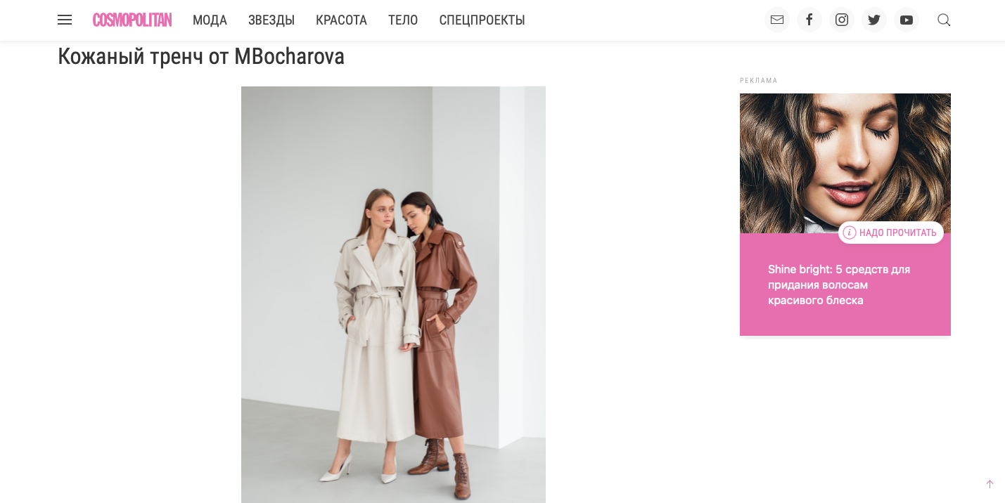 Почнемо із верхнього одягу. Це може бути куртка, пальто, тренч чи пуховик – головне підібрати те, що найзручніше для вас. Онлайн-журнал Cosmopolitan Ukraine одразу у двох добірках під назвою "Вибір Cosmo: 5 речей з нових колекцій українських брендів на осінь 2021" та "Ідеальна капсула: 7 стильних та базових речей на осінь 2021". Виділили шкіряний тренч та двоколірний тренч від Мбохарова.