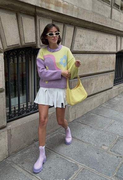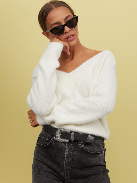 Свитера должны быть правильного кроя и вязки. Чаще всего это оверсайз с горловиной или же v-подобным вырезом.