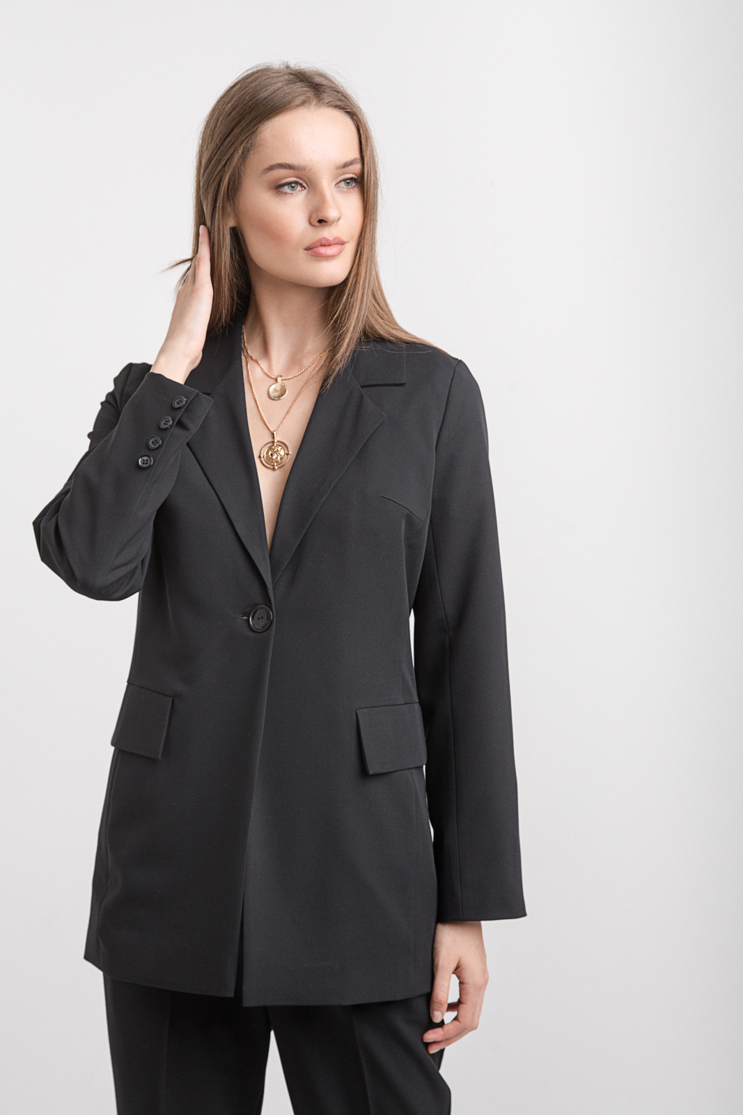 Такий піджак можна поєднувати з будь-яким низом, сукнями та спідницями. А штани палаццо підкреслять талію та врівноважують фігуру.