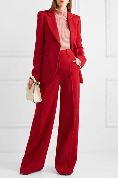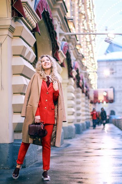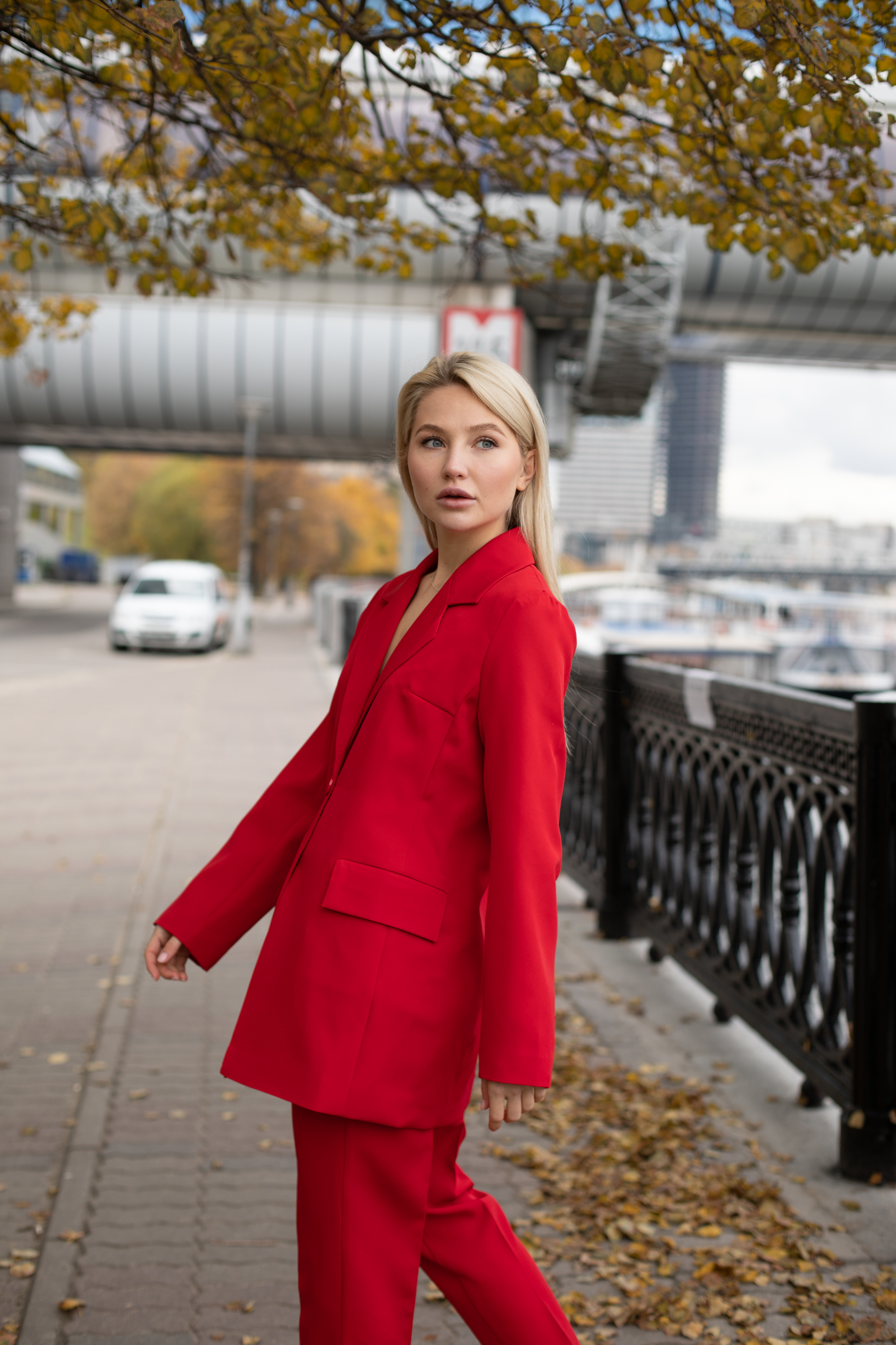 Незважаючи на сезон, яскраві кольори не здають позиції. Навпаки, хочеться виділитися із сірої маси, і яскравий костюм брюки відмінне рішення. Червоний – найпопулярніший відтінок, він для впевнених, сміливих. Його не варто боятись, адже на контрасті червоного кольору можна виділити будь-яку базову річ. Він близький до класичного, тому підійде як до офісу, так і на побачення чи вечірку.
