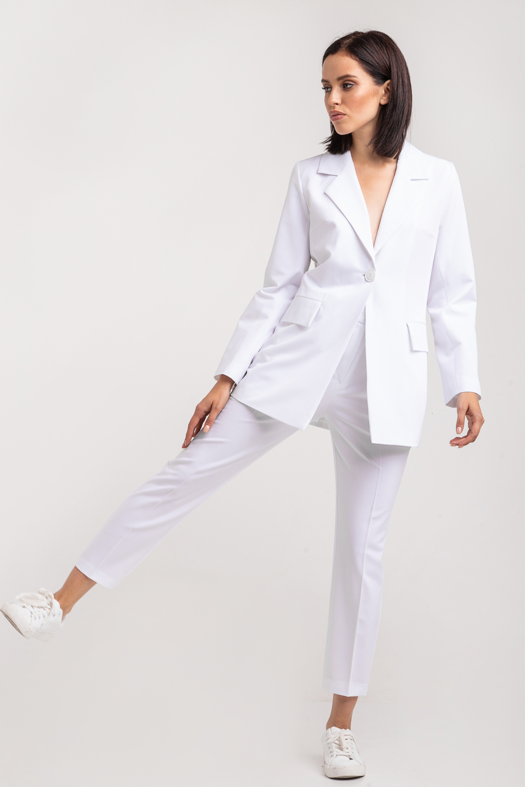 Бездоганний total white: двобортний жакет та штани з правильною високою посадкою. Виконаний з ніжної костюмної тканини. Він зручніший, не сковує рухів, і багатофункціональний. Такий костюм для тих, хто любить лаконічність, простоту, але водночас елегантність та стиль.