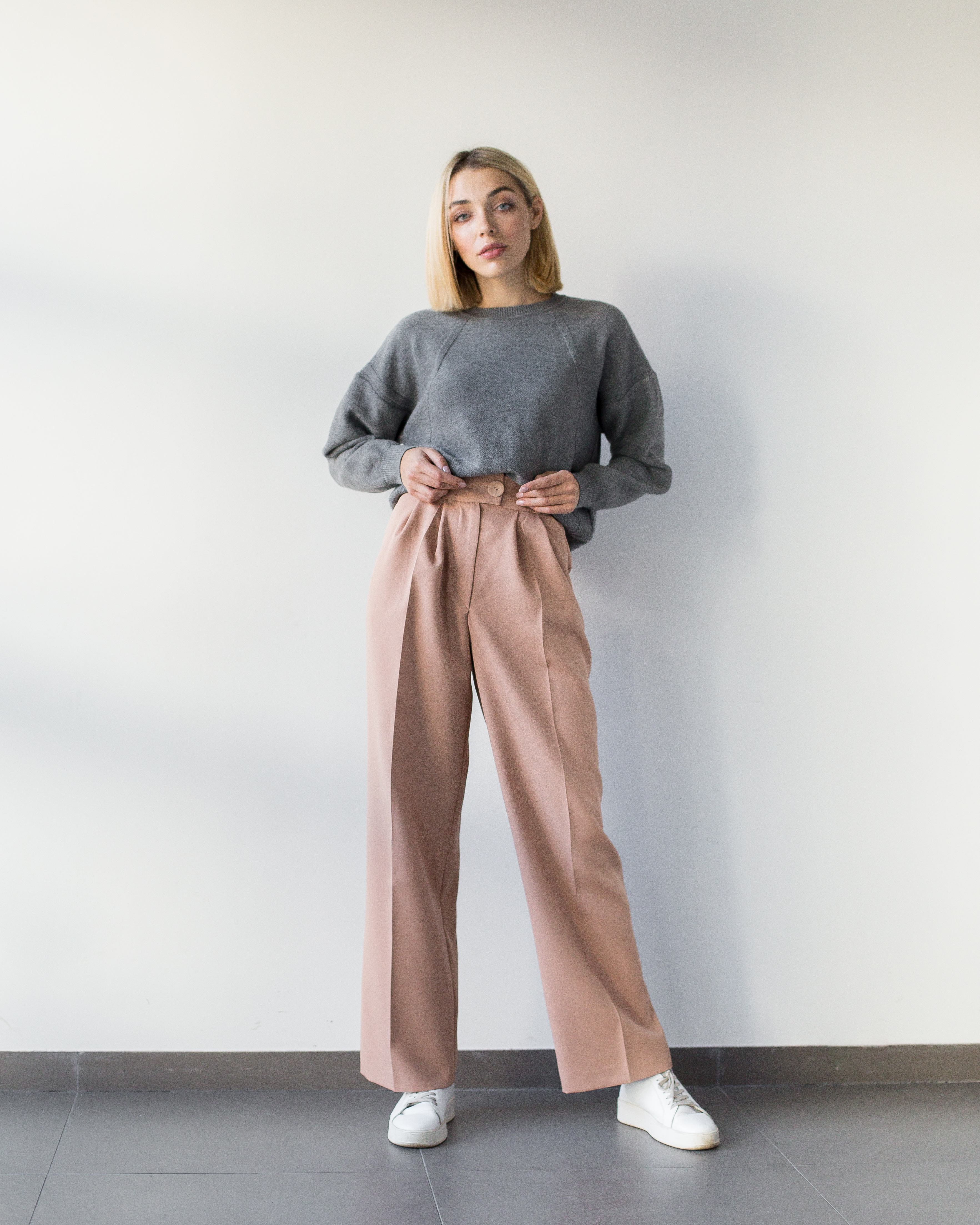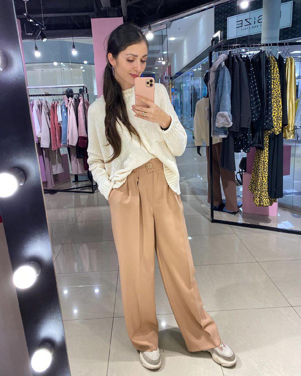 Штани палаццо кольору кемел+ светр оверсайз+ кросівки - формула ідеальної офісної цибулі. Брюки-палаццо акцентують увагу на талії, а заправлений светр грає на контрасті.
