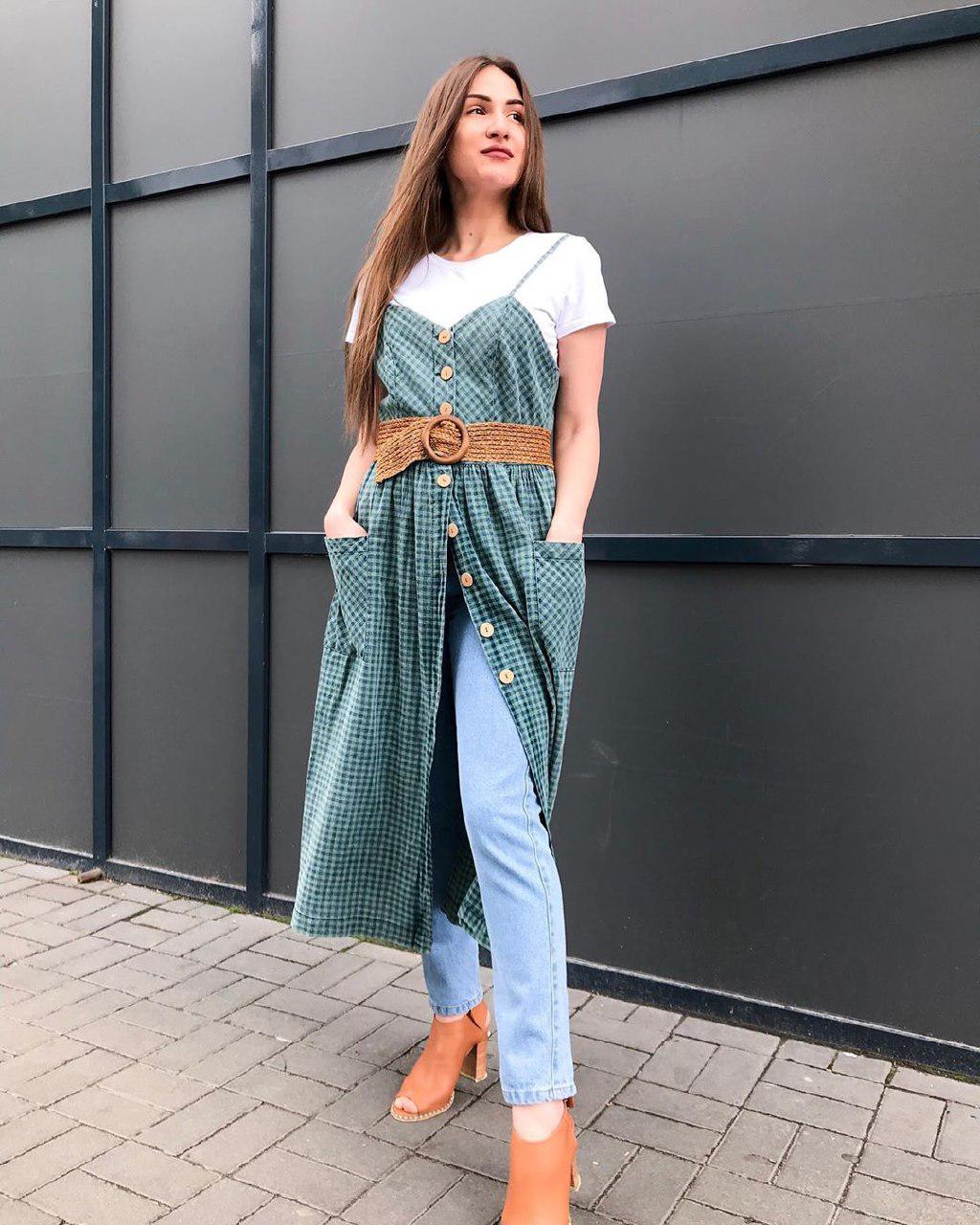 Якщо хочеться чогось цікавого, можна спробувати одягти на футболку сарафан. Таке поєднання вже давно стало трендом і виглядає дуже цікаво. При чому сарафан може бути з будь-яким принтом і будь-якого кольору: якщо буде чорний – футболка гратиме на контрастах, а білий сарафан з такою ж футболкою створить ніжний та романтичний образ.